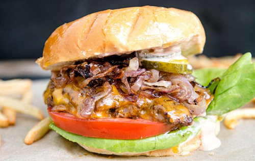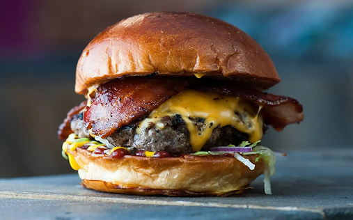 Grilled beef patty with pineapple slice, crispy bacon, and teriyaki.