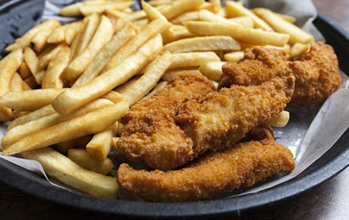4 chicken strips with fresh cut fries and plum sauce